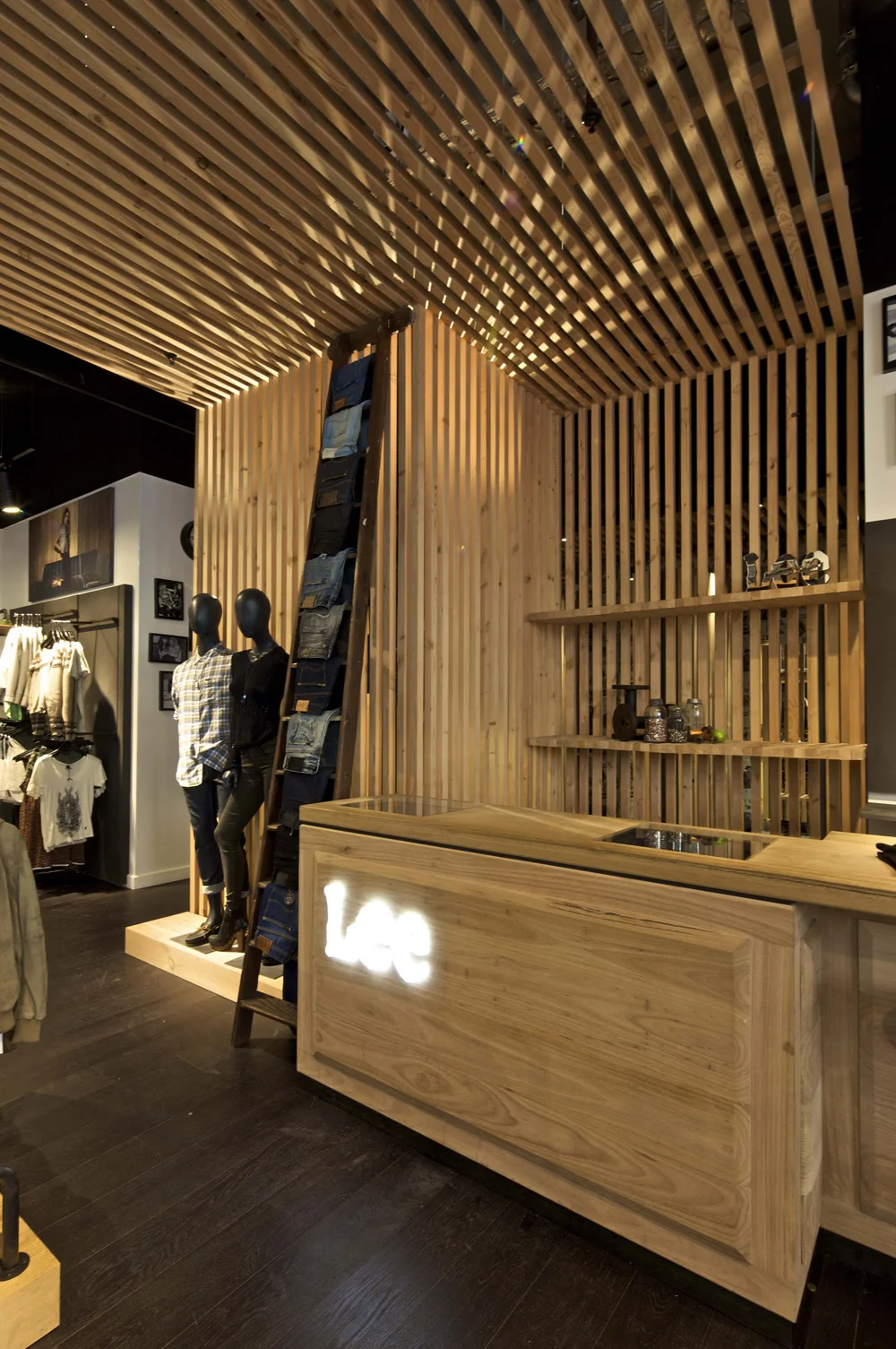 By embracing the materials and colours palette given by Lee international we were able to develop concept stores that responded to the geometry of each site. Strong architectural features formed by timber battens gave the stores a warmth look while keeping them interesting to explore. The long denim bar as the main feature of the stores gives the customer the ultimate denim experience.